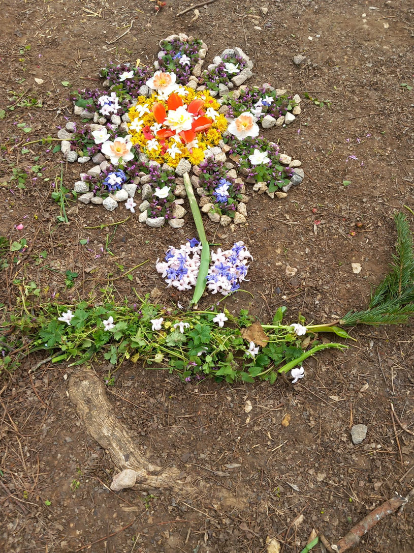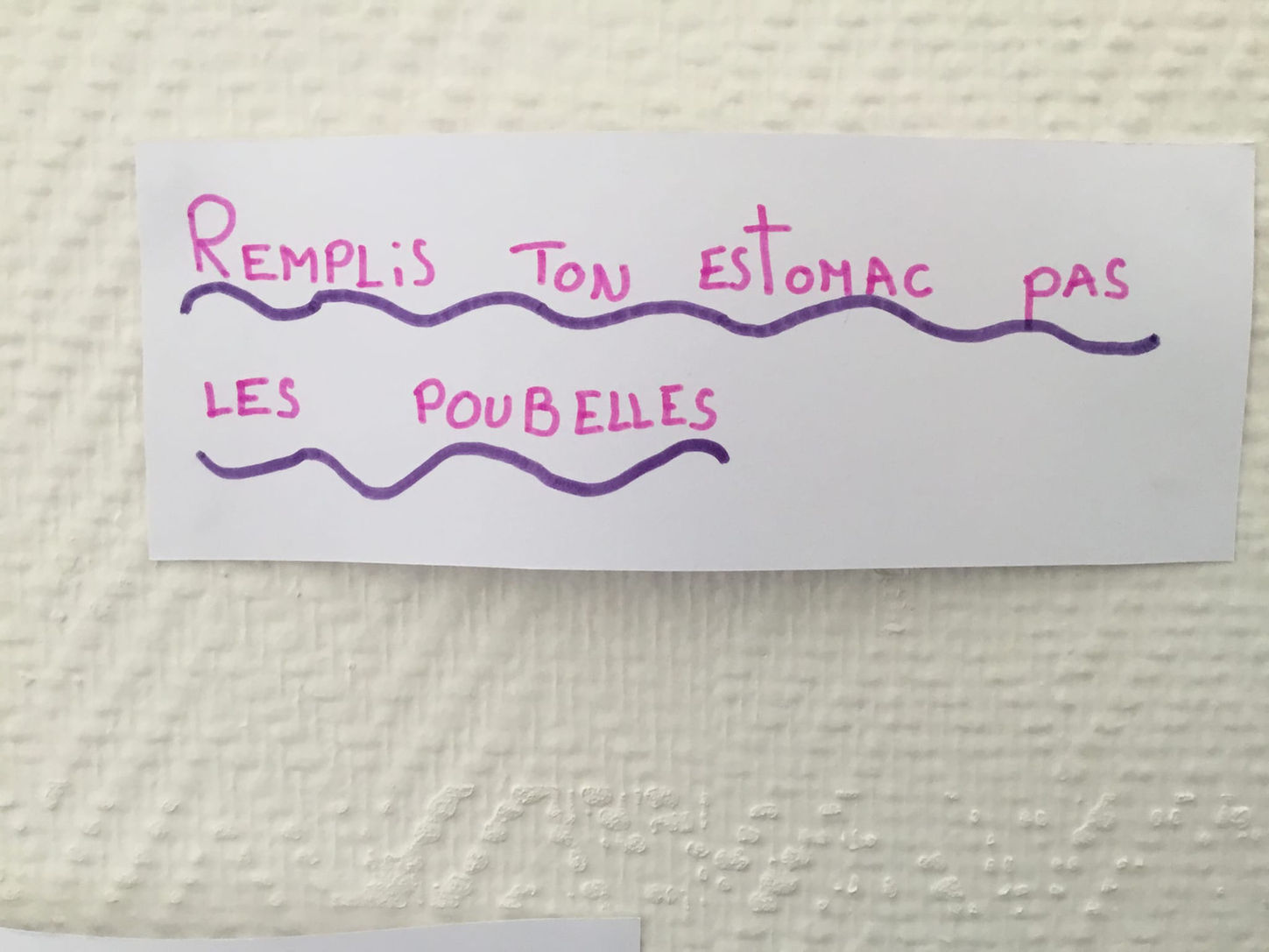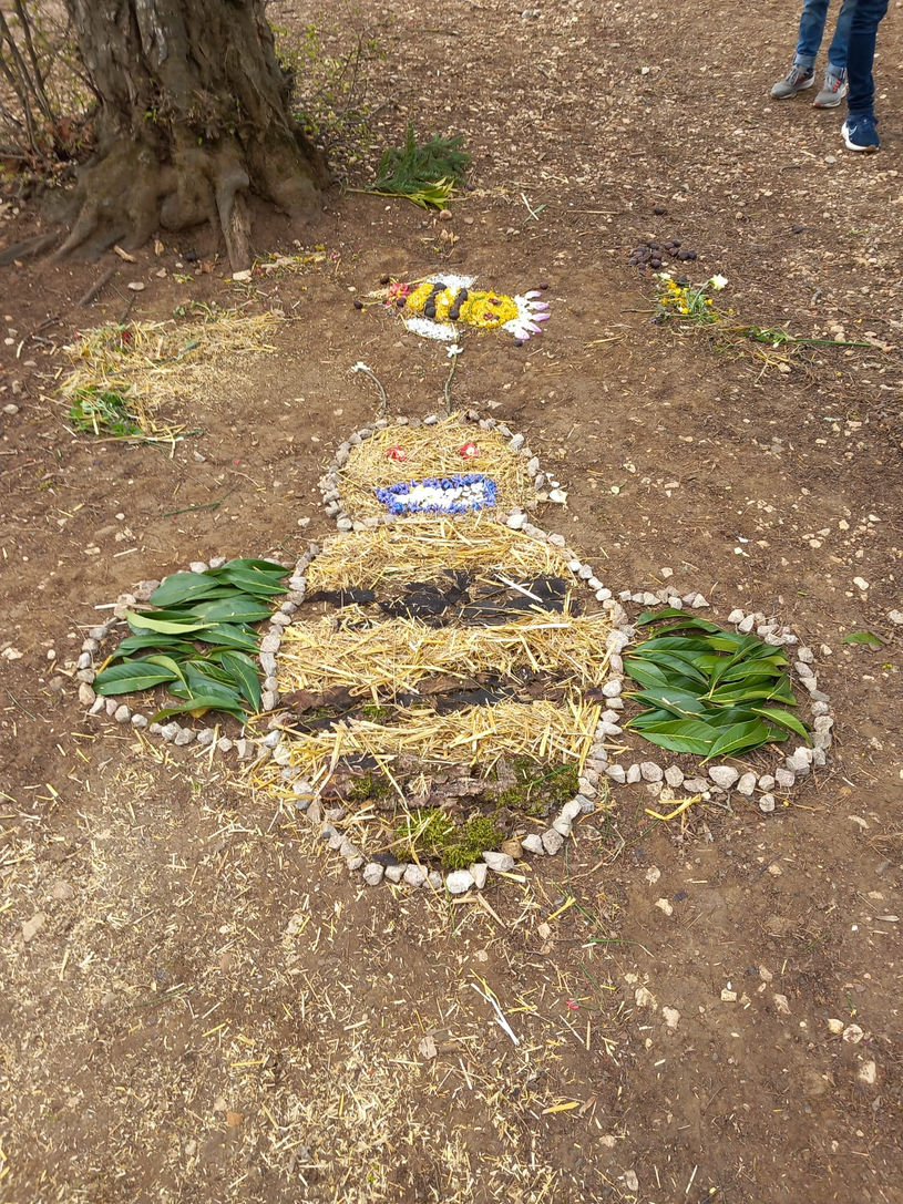 D’abord, nous avons fait des slogans que nous avons accrochés dans la cantine, dans la salle des professeurs, dans les toilettes et dans les salles de classe : « Nous avons ensuite fait du land art, c’est-à-dire des dessins faits par terre avec des éléments naturels comme des feuilles, des cailloux, de la paille… Ces dessins devaient former une fleur ou une abeille, l’abeille étant un symbole de la biodiversité. Nous avons bien aimé faire ce projet.