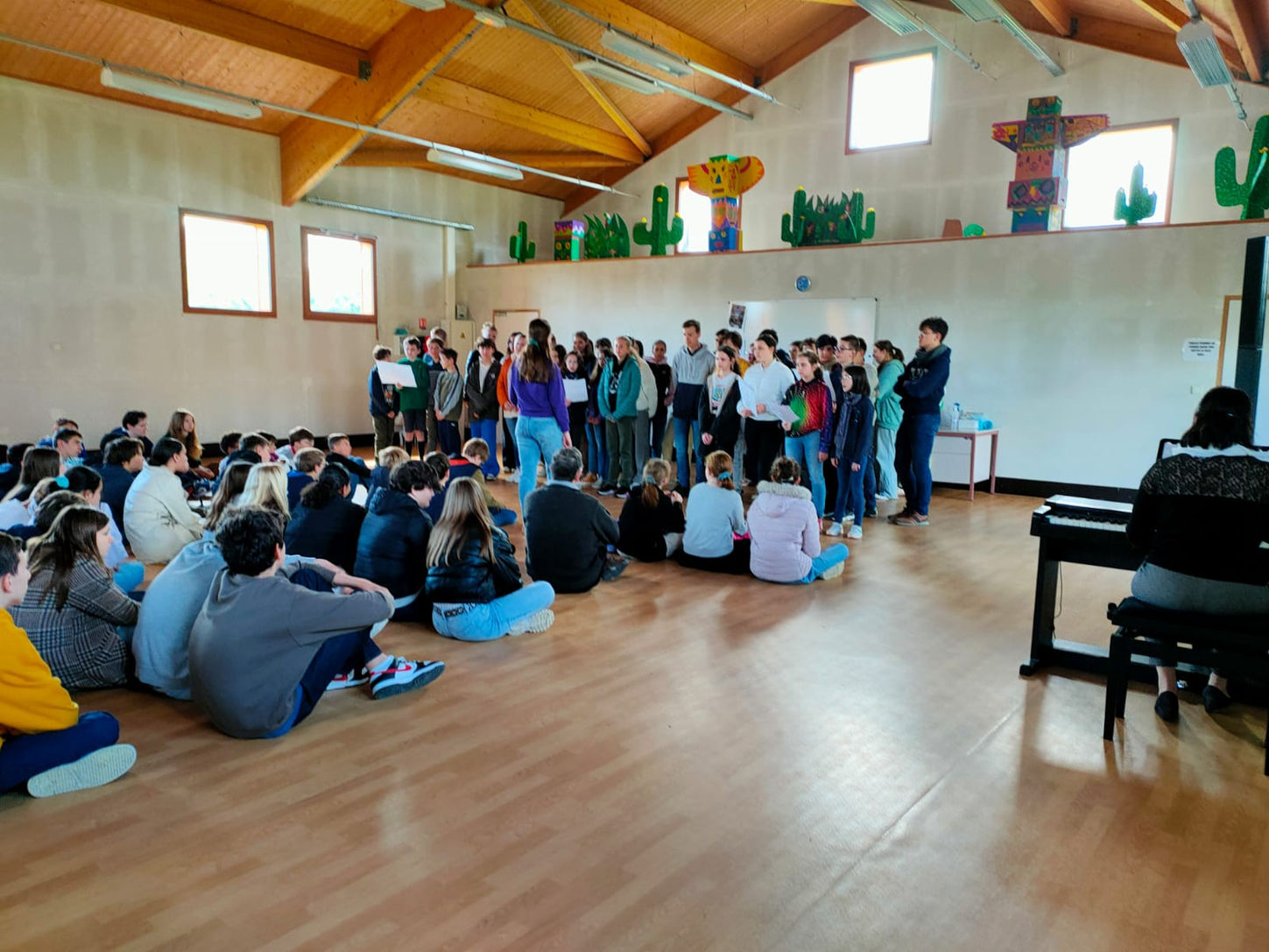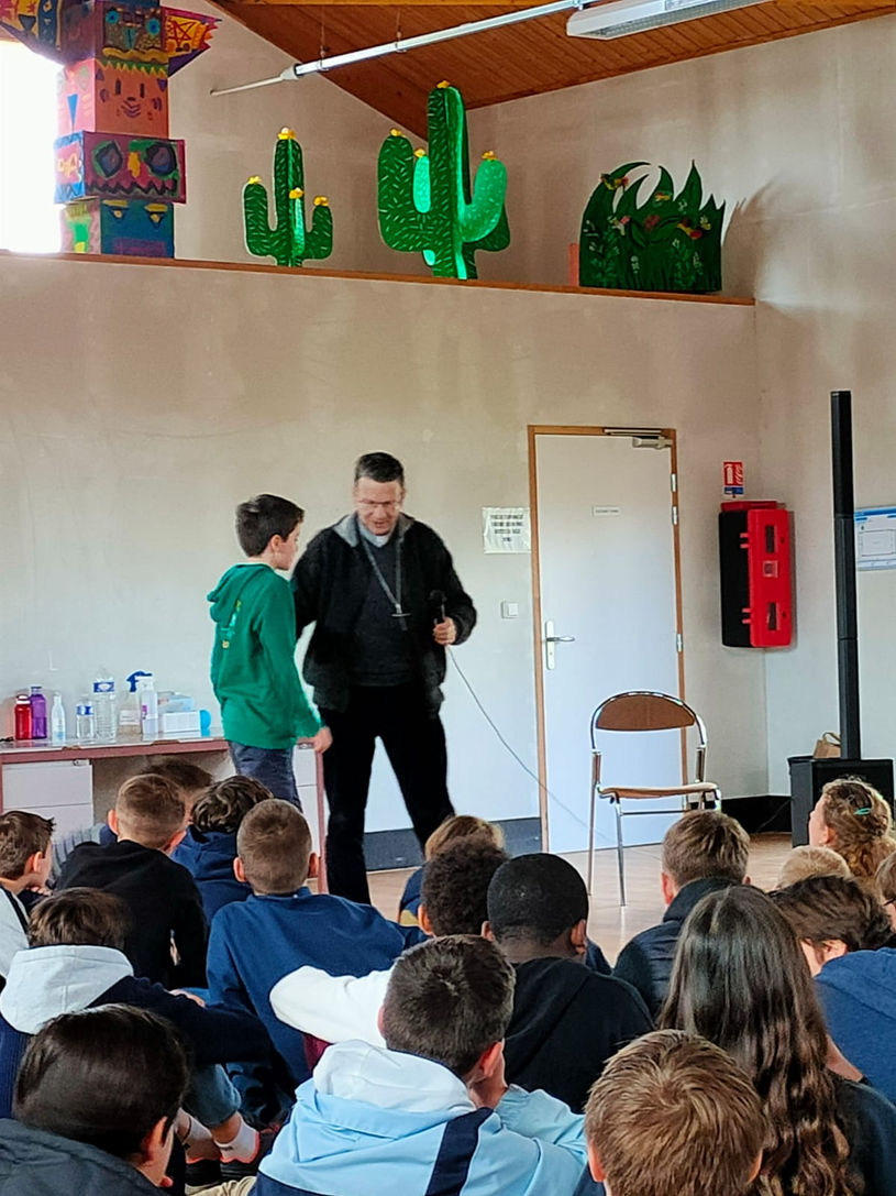 Au cours de la journée, il a pu rencontrer toutes les personnes de l’établissement : le personnel le matin autour d’un café, puis il est passé dans chaque classe de maternelle où il a raconté des « histoires » à partir des prénoms des élèves, puis auprès des classes de CP, CE1, CE2 qui étaient réunies, puis c’était le tour des collégiens tous rassemblés en salle multiactivités, ils ont débuté la rencontre par un chant préparé par la chorale. Les sujets abordés étaient variés, allant du très concret (quelles études faut-il faire pour être prêtre, combien gagne un prêtre, quelles sont vos passions ? …) au plus profond (que pense l’Eglise de l’écologie, comment réussir sa vie, comment entendre Dieu ? …) . A midi Monseigneur Rivière a déjeuné avec les enseignants avec lesquels il a ensuite discuté, puis les CM1-CM2 ont pu lui poser leurs questions et enfin l’équipe d’animation pastorale. La journée s’est achevée par un temps de prière à l’église où tout le monde s’est rassemblé. Les élèves ont offert à Monseigneur Rivière un tableau représentant un arc en ciel réalisé avec les mains des enfants de maternelle ; autour de l’arc en ciel, chaque classe avait écrit une phrase importante pour elle, comme par exemple : « Quelle joie de nous retrouver avec les copains dans cette belle école ! ». Les élèves ont été très heureux de pouvoir rencontrer l’évêque et de discuter tout simplement avec lui. Une très belle journée de rencontres et d’échanges. Témoignages recueillis auprès des élèves de 6° : « Il était très drôle ! », - « Ce n’est pas parce qu’on est prêtre qu’on n’a pas une vie comme tout le monde : Monseigneur Rivière a des amis, il fait du vélo … » - « Il était très ouvert aux gens, il prenait le temps de nous connaître ».